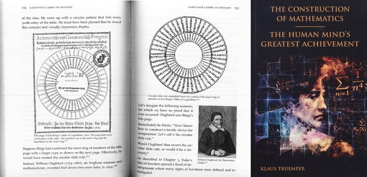 Am beigefügten Beispiel scheint beides zuzutreffen. «Zur Würdigung der Meisterleistung Jost Bürgis habe ich in der letzten Auflage meines Buches einen kleinen Schritt von der zweidimensionalen Darstellung in die dreidimensionale Realität gewagt» schreibt Blog-Leser Klaus Truemper «und auf Lexan-Kunststoff die beiden Skalen der arithmetischen und geometrischen Zahlenfolgen drehbar zueinander so angeordnet, dass wir die erste echte dreidimensionale Bürgi-Rechenscheibe in den Händen halten». Und der Buchautor fährt fort: «Wenn Bürgi dieses Thema verfolgt hätte, wäre er 1620 auch Erfinder der Rechenscheibe geworden und nicht erst William Oughtred im Jahre 1632.» Die zeitliche Reihenfolge ist ebenso unumkehrbar wie die inhaltliche: 1620 publiziert Bürgi sein Titelblatt mit den ersten Progresstabulen und der ersten kreisartigen Gegenüberstellung zweier logarithmischer Skalen. Somit ist die Rechenscheibe nur teilweise Oughtreds Erfindung. Die Voraussetzungen für Ouhgtred schuf Bürgi.